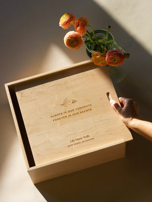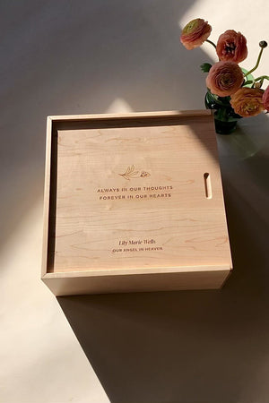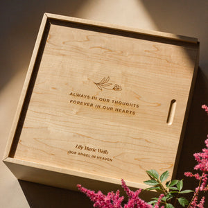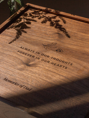 Preserve the memories of your loved one with a memorial box that is as unique as they were. Choose from deep and rich Walnut or light and airy Poplar/Maple wood and personalize it with the details most important to you. Engraved to perfection, this keepsake is not meant to hide in the back of a closet. This makes an elegant, thoughtful gift for the ones you love or for a personalized, special space to keep your prized mementos.