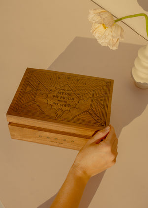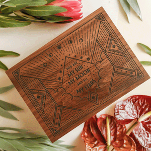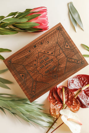 Celebrate the entirety of your love and all of the memories to come with the gift of the Sun Moon and Stars keepsake box. This handcrafted keepsake box is etched with E.E. Cumming’s everlasting poetry to express to your special someone that your love is greater than the cosmos.