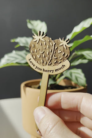 Give your favorite person a daily reminder that your love is as sweet as a ripe summer strawberry with this whimsical berry plant pick. Laser cut out of wood, this playful plant marker makes a cute companion for any houseplant.