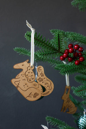 Jump into the holiday spirit with a new way to bring a little more whimsy to the season. Each ornament delivers a playful message, laser cut into sustainable wood and finished with an Italian cotton ribbon. Equally at home hanging next to Nana’s heirloom Santa or your preschooler’s December art project.