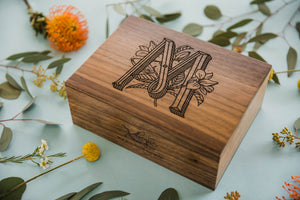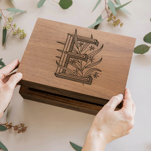 Each keepsake box is carefully constructed with certified sustainable walnut wood and features hidden hinges so that the lid opens seamlessly to 90 degrees. We laser cut and hand stain each keepsake box one at a time in our sunny Los Angeles studio to ensure the beauty of the design lasts a lifetime. This makes a thoughtful gift for the ones you love or for an extra special place to keep your prized mementos.