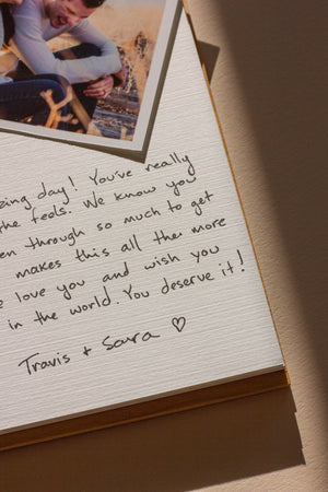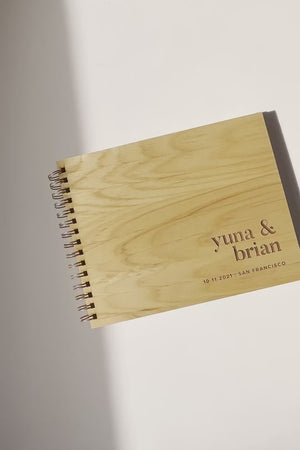 Each guest book comes to life from two unique pieces of sustainable hardwood. Filled with blank white linen pages and hand bound to lay flat when opened, this guest book makes writing well wishes and sweet memories easy for your guests.
